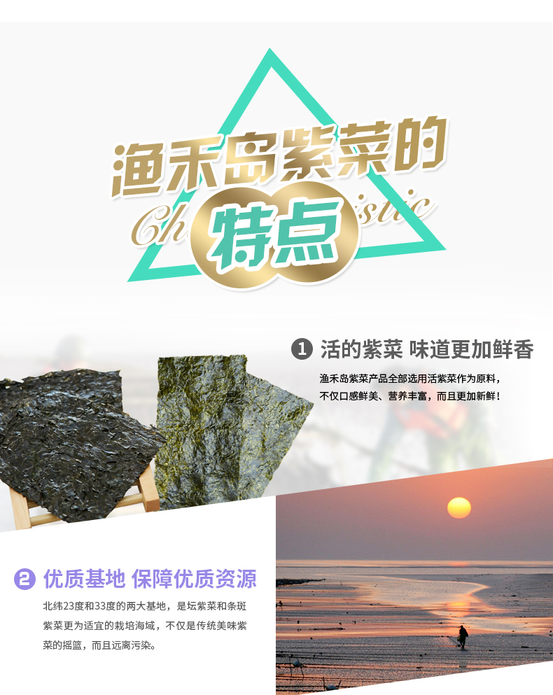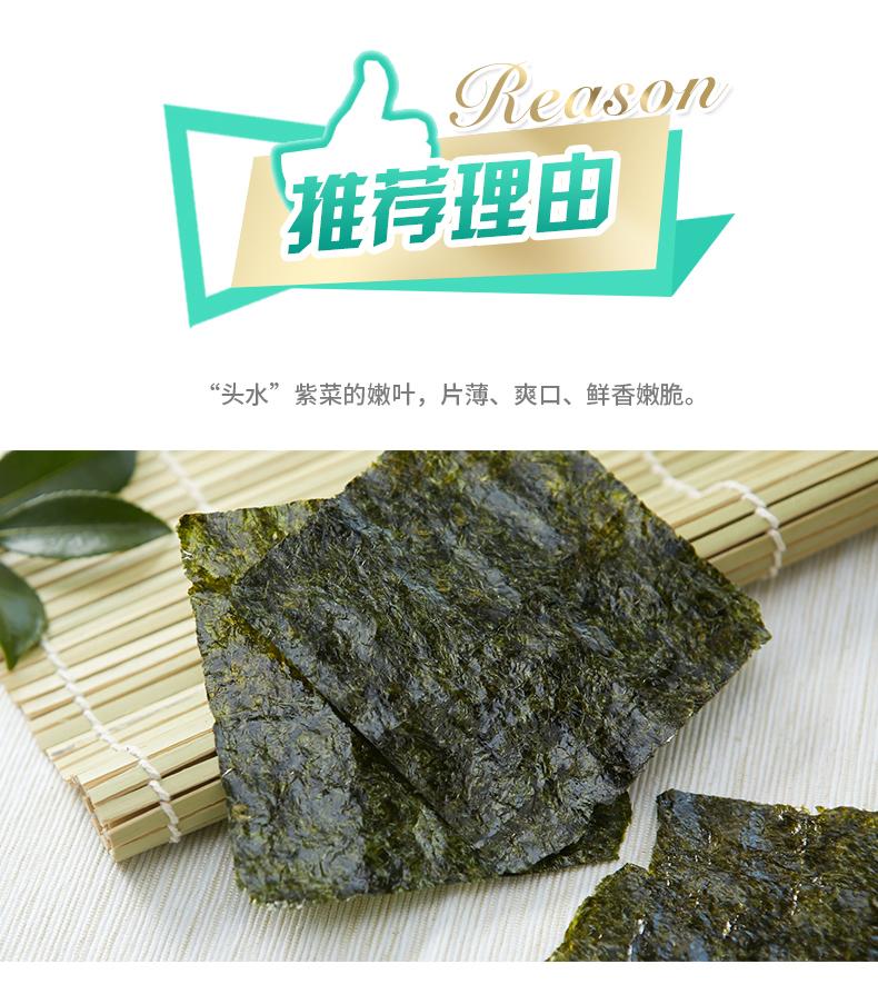 孕育于北緯33°清澈純凈的遠(yuǎn)海,臻選紫菜中珍貴稀有的第一水嫩芽,入口即化;